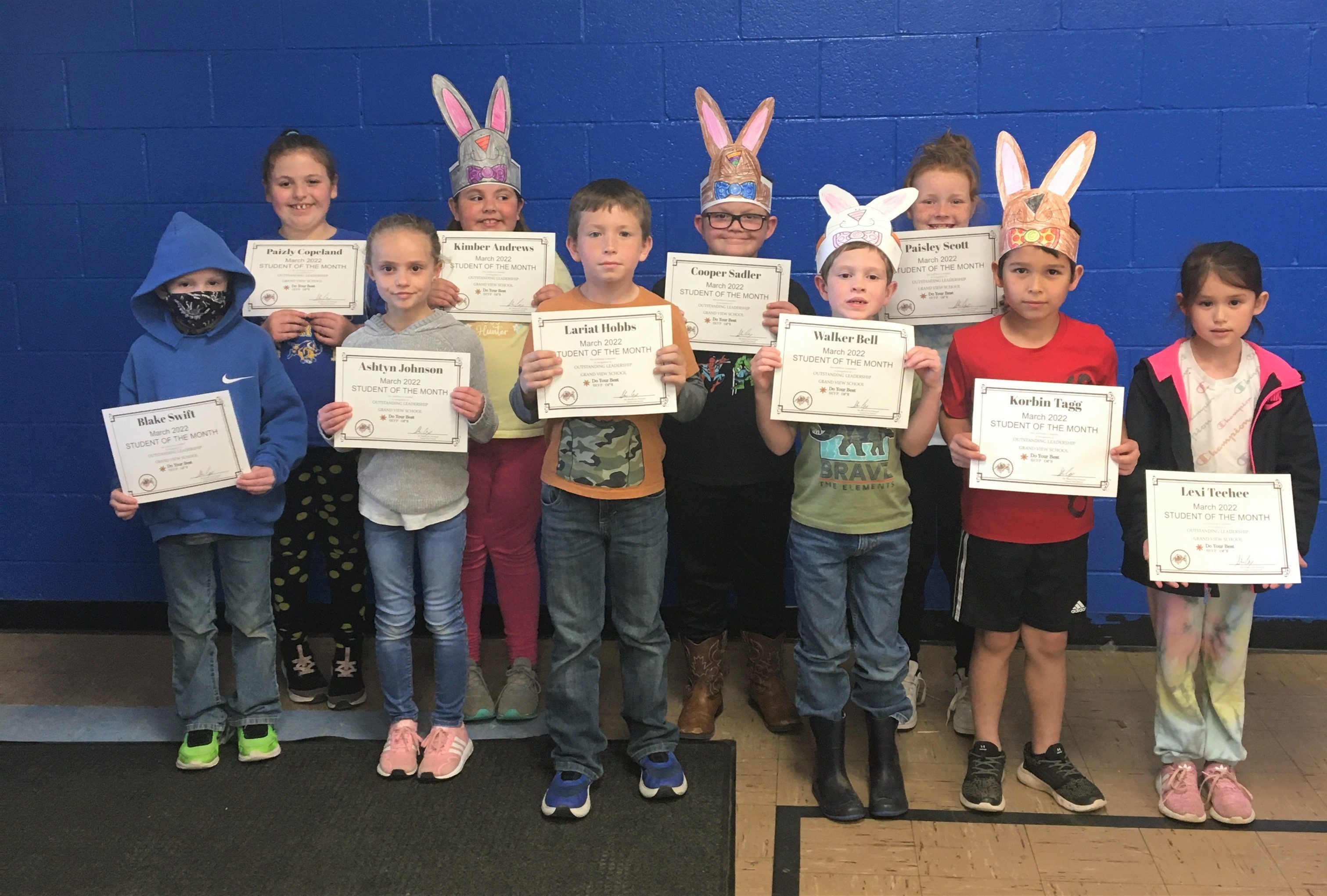 Grand View School first and second grade students who were honored as March Students of the Month are, front row, from left: Blake Swift, Ashtyn Johnson, Lariat Hobbs, Walker Bell, Korbin Tagg, Lexi Teehee. Back row: Paizly Copeland, Kimber Andrews, Cooper Sadler, Paisley Scott. Not pictured: Henley Green, William Sierra